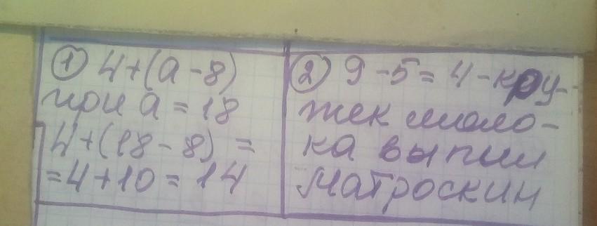 1. 4+(а-8), если а=18- 4+(18-8)- 18-8=10- 4+10=14: 2. Нужно 9-5=4 Ответ: Матроскин выпил 4 кружки молока