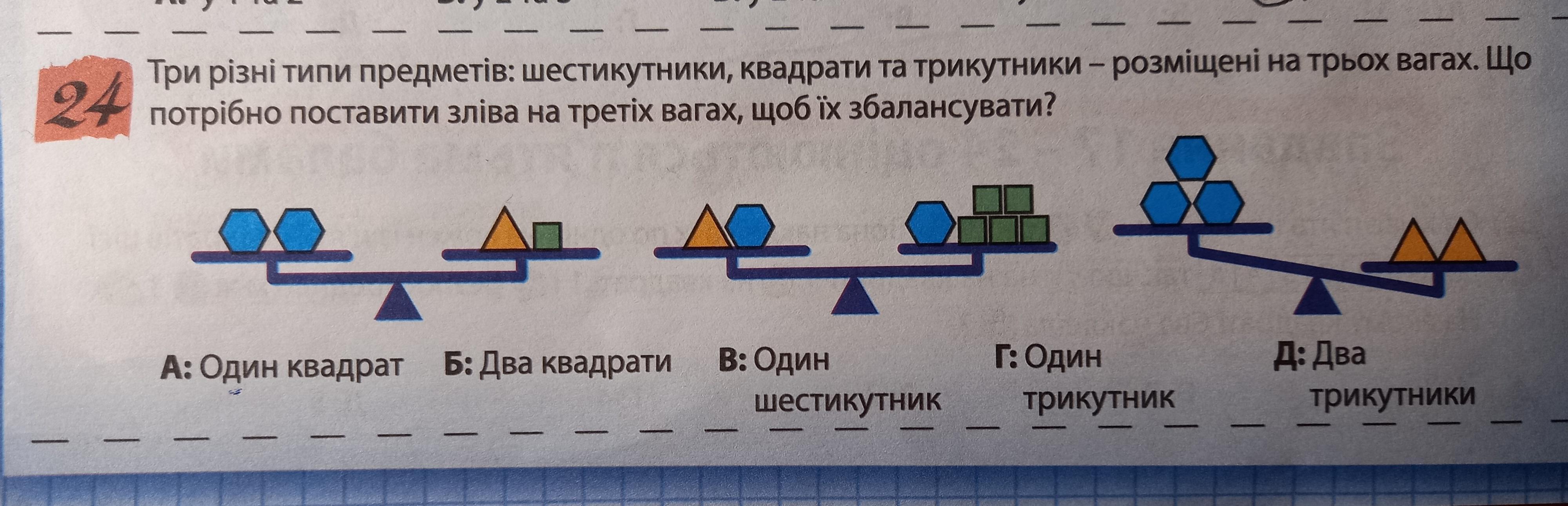 Три різні типи предметів: шестикутники, квадрати та трикутники- розміщені на трьох вагах. Що потрібно поставити зліва на третіх вагах, щоб їх збалансувати?