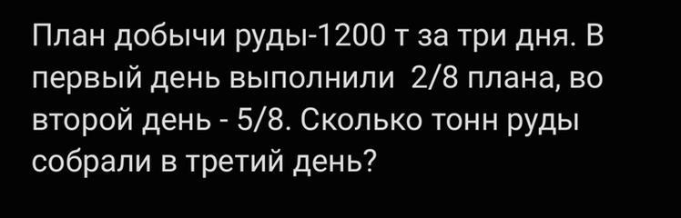 План добычи руды 1200 т за три дня в первый день выполнили 2/8 плана а во второй день 5/8 сколько тонн руды собрали в третий день?