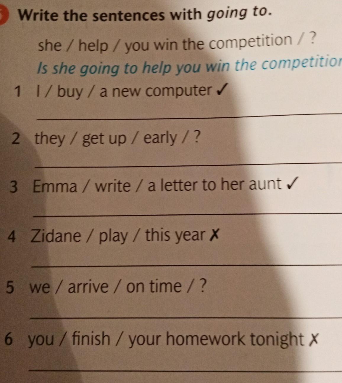 1 I’m going to bought a new computer 2 Are they going to get up early?3 Emma is going to written a letter to her aunt 5 Are we going to arrived on time ?