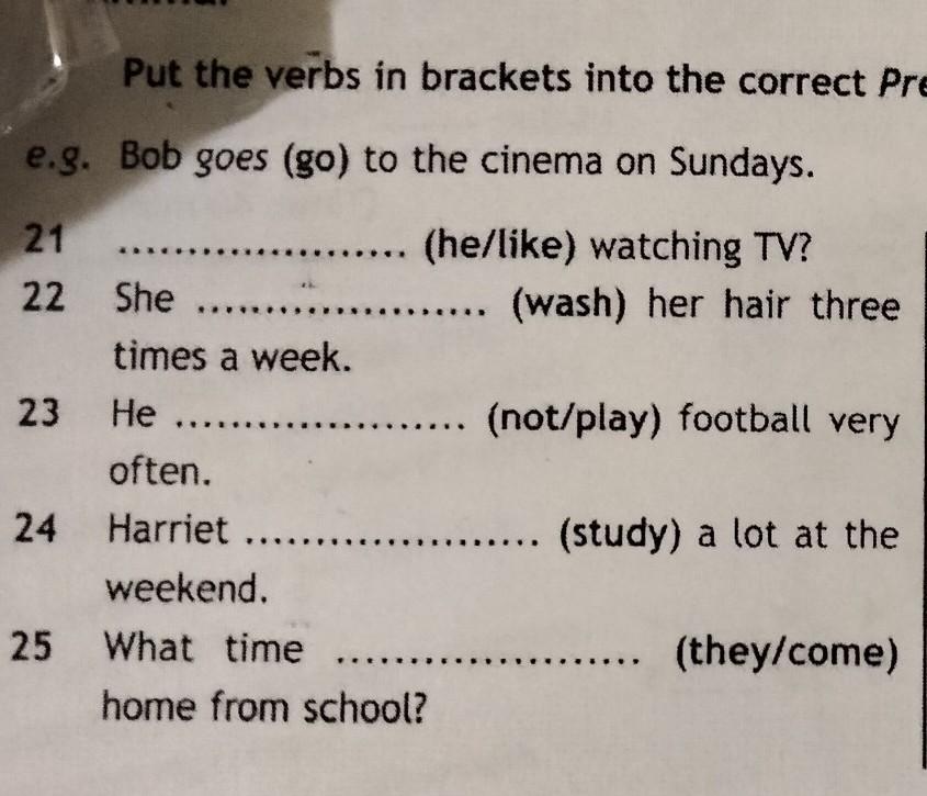 He is like watching TV She is washing her hair three times a week He isn’t playing football very often Harriet is studying a lot at at the weekend What time are they coming home from school ?