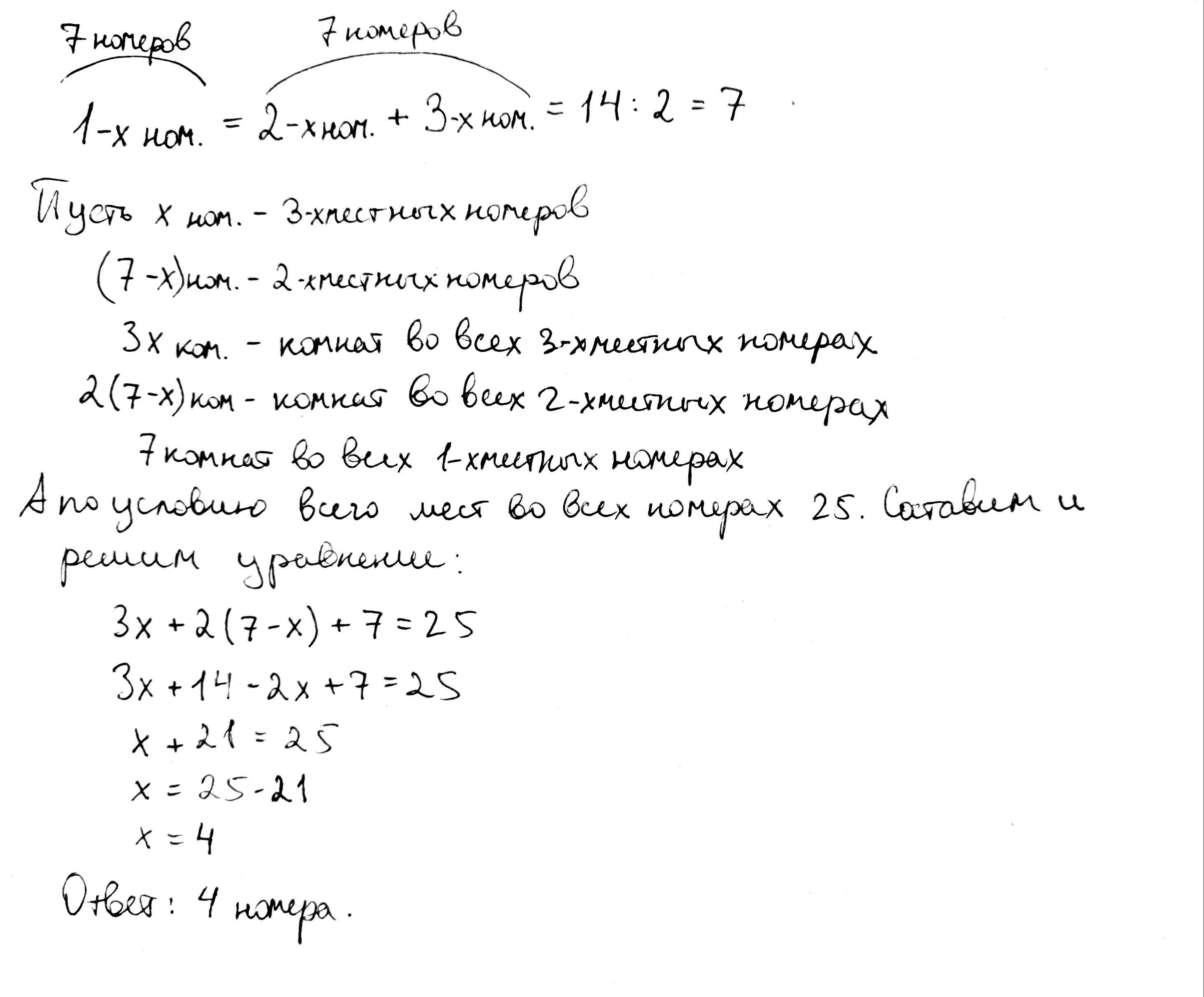 В гостинице имеются одноместные, двухместные и трёхместные номера. Всего номеров 14, а всего мест во всех номерах 25. Одноместных номеров столько, сколько двухместных и трёхместных вместе. Сколько в гостинице трёхместных номеров?