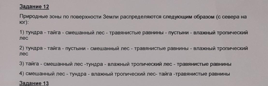 1) тундра - тайга - смешанный лес - травянистые равнины - пустыни - влажный тропический лес