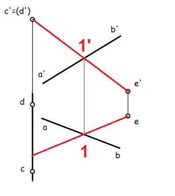 На фронтальной проекции провести отрезок е_c-d. Он пересекает а'b' в точке 1', которую сносим на горизонтальную проекцию - это точка 1.