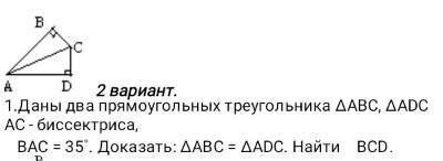 даны два прямоугольных треугольника ∆ABC, ∆ADC, AC - биссектриса, BAC = 35°. Доказать: ∆ABC = ∆ADC. Найти: BCD