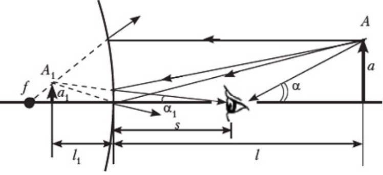 автомобиля от углового размера самого автомобиля, если фокусное расстояние зеркала f=1 м, а расстояние от глаз водителя до зеркала s=0,5 м? Считайте, что это расстояние значительно меньше расстояния l от зеркала до приближающегося сзади автомобиля.
