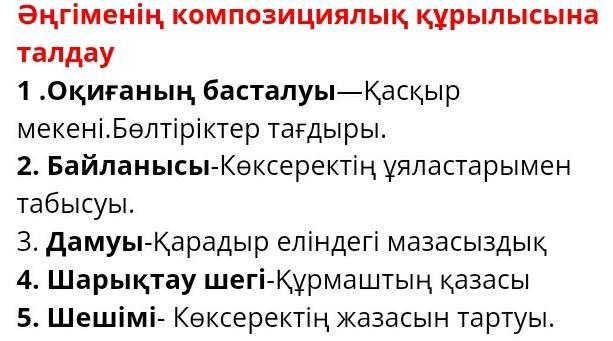 Шешімі- Аққасқаның Көксерек пен айқасы. Көксеректің өлімі. Құрмаштың әкесінің Көксеректі басқа теуіп, Құрмашын жоқтауы.