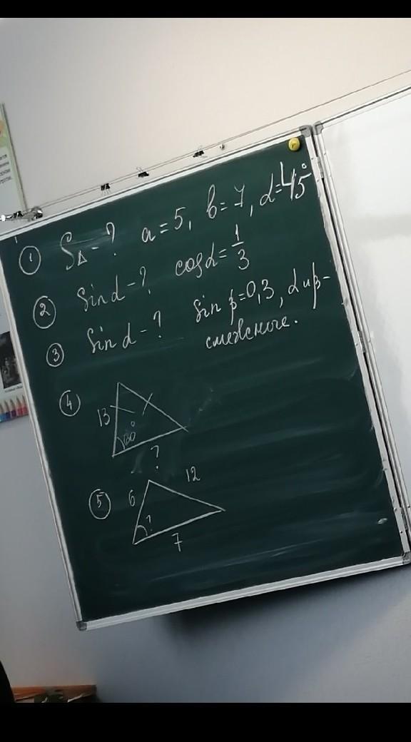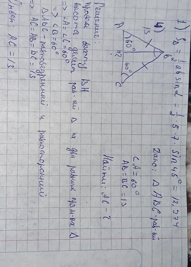 1)S( треуг.) = 1/2*а*в*sin α , S( треуг.) = 1/2*5*7*sin45=(35/2)*(√2/2)=...