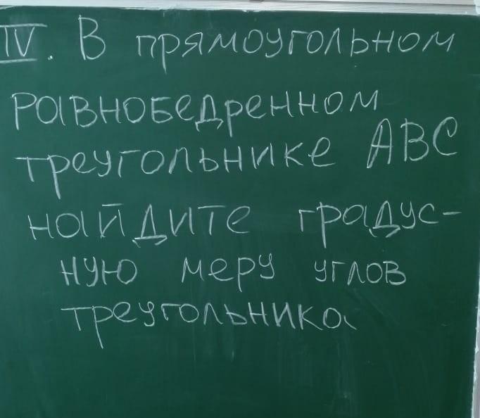 В прямоугольном треугольнике один из углов = 90° , тогда на два других равных угла (так как треугольник равнобедренный) приходится 180°-90°=90° . А на один угол приходится 90°:2=45° .