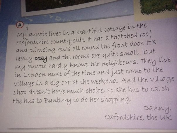 Моя тётушка живёт в замечательном коттедже в сельской местности Оксфордшира. Крышка коттеджа состоит из соломы, а вокруг передней двери растут вьющиеся розы. Коттедж тесный, комнаты довольно маловаты. Однако моя тётушка плохо знакома со своими соседями. Они большинство своего времени живут в Лондоне, а в село просто приезжают по выходным на большой машине. Небогат выбор продуктов в сельском магазине, и поэтому моей тётушке приходится ловить автобус и ехать за покупками в Банбери.