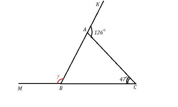 В треугольнике ABC внешний угол при вершине А равен 126°, а внутренний при вершине С равен 47°. Найдите внешний угол при вершине В