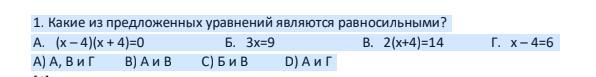 А. (х – 4)(х + 4)=0 Б. 3х=9 В. 2(х+4)=14 Г. х – 4=6