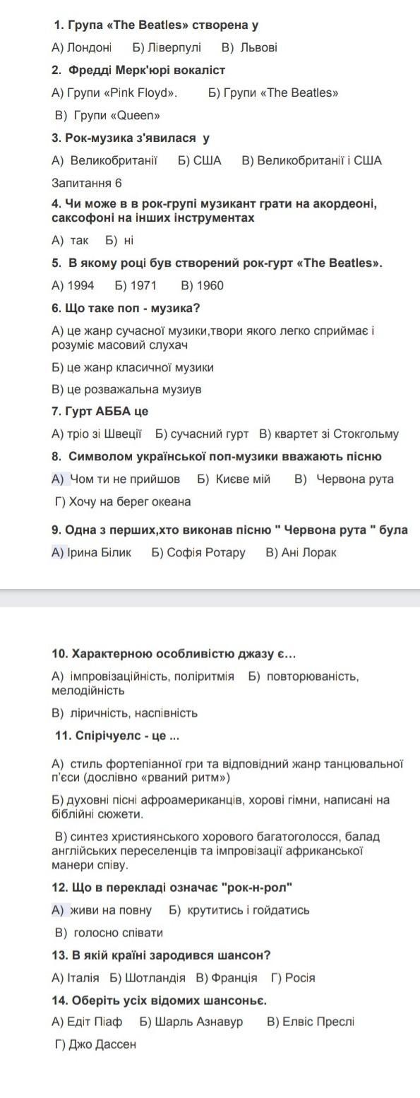 Ответ:1. б) 2 в) 3 б) 4 б) 5 в) 6 а) 7 а) 8 в) 9 а) 10 а) 11 б) 12 б) 13 в) 14 б)
