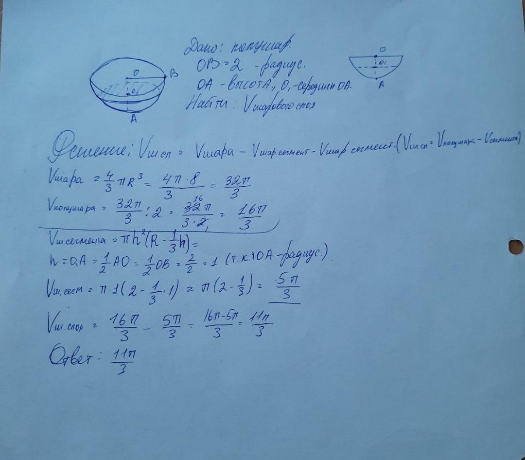 через середину высоты полушара радиуса 2 проведена плоскость параллельно основанию Найдите объём шарового слоя