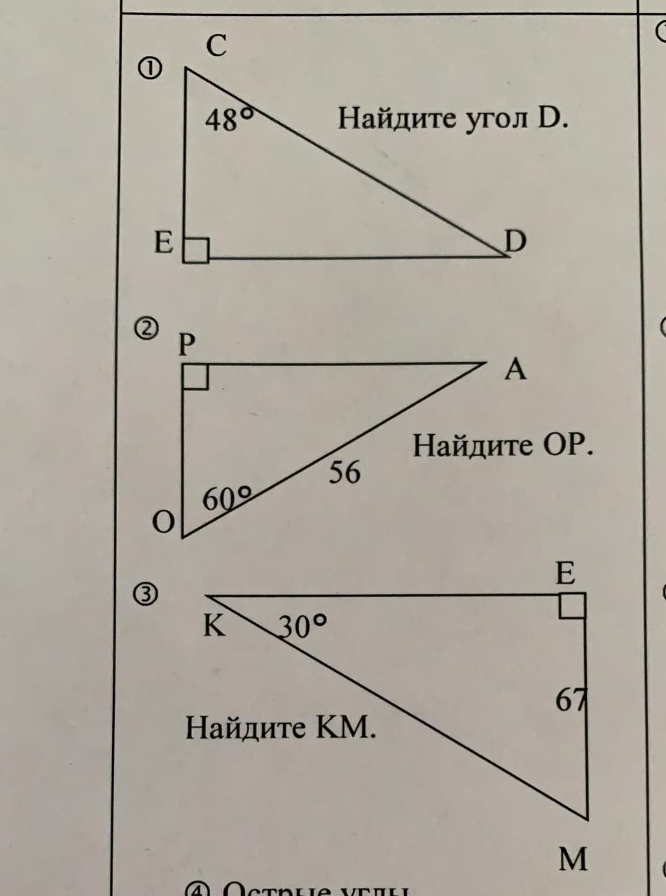 Объяснение: Сумма острых углов в прямоугольном треугольнике равна 90°, значит угол D=90-48=42°