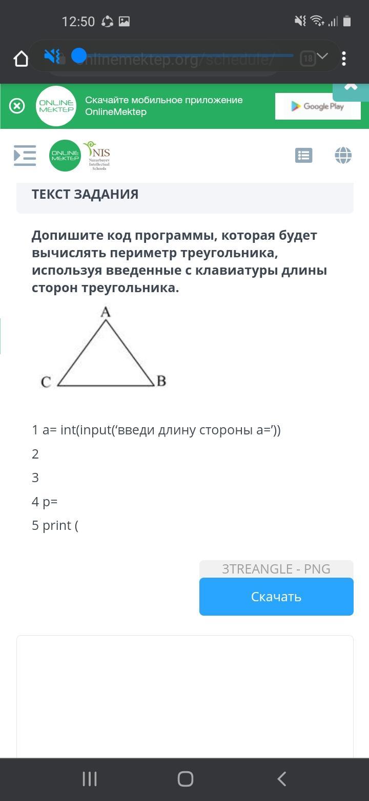 Допишите код программы, которая будет вычислять периметр треугольника, используя введенные с клавиатуры длины сторон треугольника.