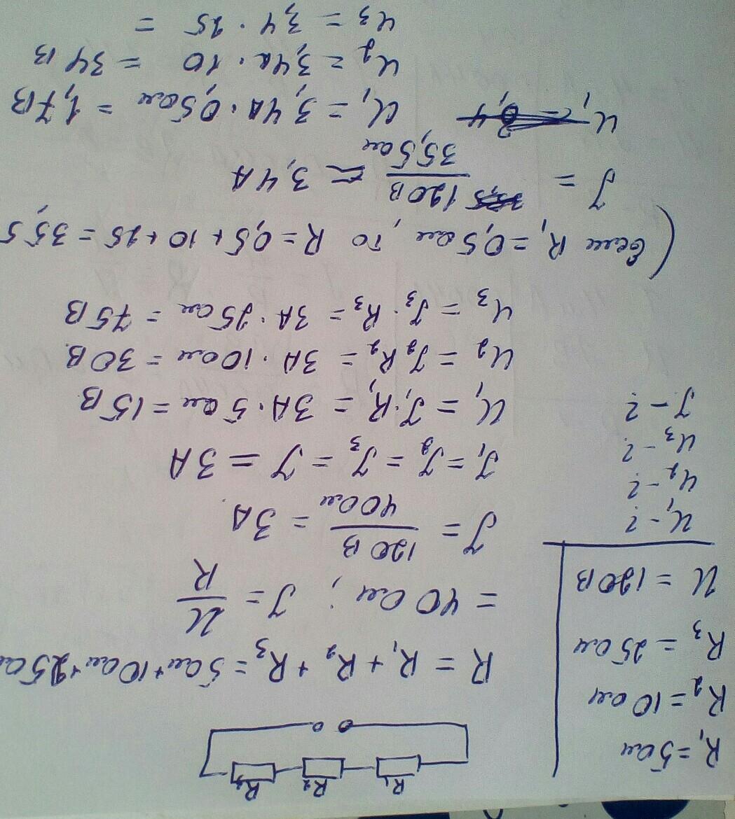 Резисторы соединены последовательно с тремя резисторами 0,5 Ом, 10 Ом и 25 Ом, подключенными к постоянному напряжению 120 В. Определите напряжение по току в каждом резисторе.