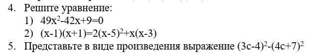 7x-3=0 7x=3 2)(x-1)(x+1)=2(x-5)^2+x(x-3) x^2-1=2(x-5)^2+x^2-3x -1=2(x^2-10x+25)-3x -1=2x^2-20x+50-3x -1=2x^2+23x-50=0 -51+2x^2-23x=0 51+2x^2-23x=0 2x(x-3)-17(x-3)=0 x-3=0 2x-17=0 x=3