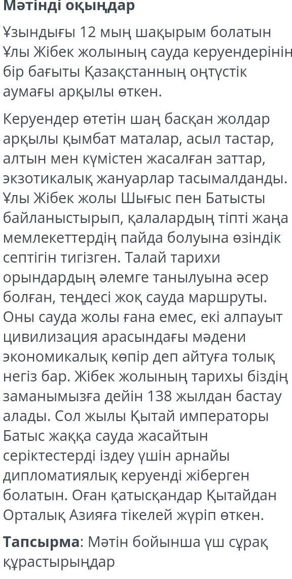 1-сұрақ: Ұлы Жібек жолының сауда керуендерінің бір бағыты Қазақстанның қандай аумағы арқылы өткен?(жауабы оңтүстік)