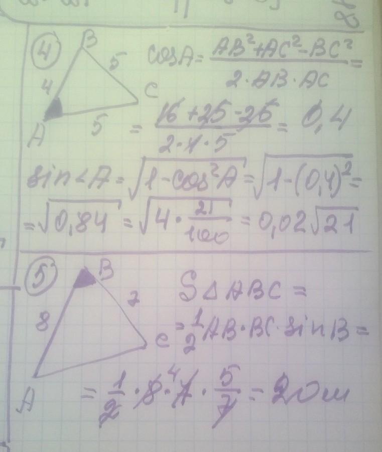 5. Найдите площадь треугольника, если стороны АВ = 8м, ВС = 7 м,