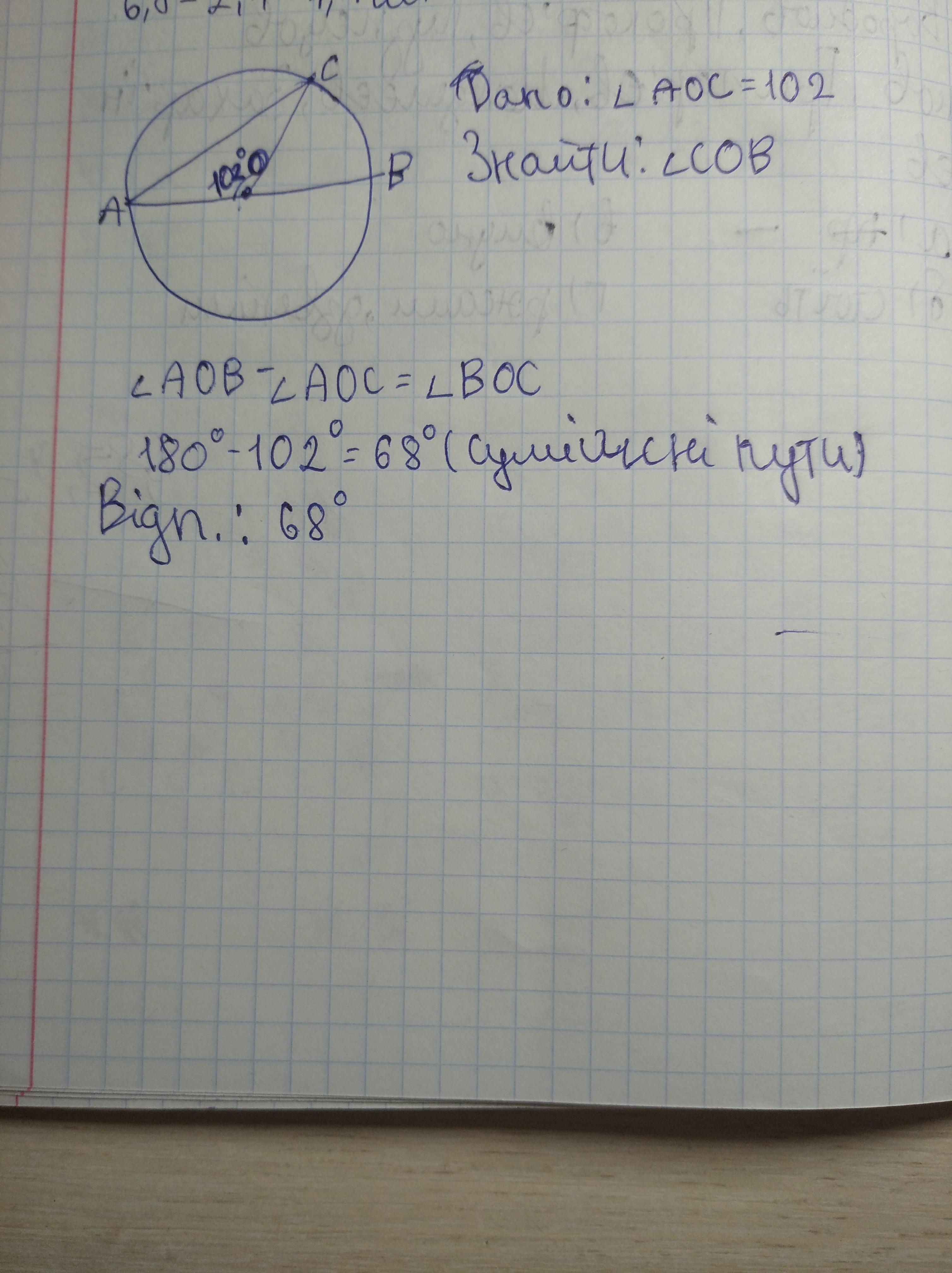 У колі з центром о проведено діаметр АВ і хорду АС. Знайти кути трикутника ВОС, якщо кут АОС дорівнюс 102 градуси.