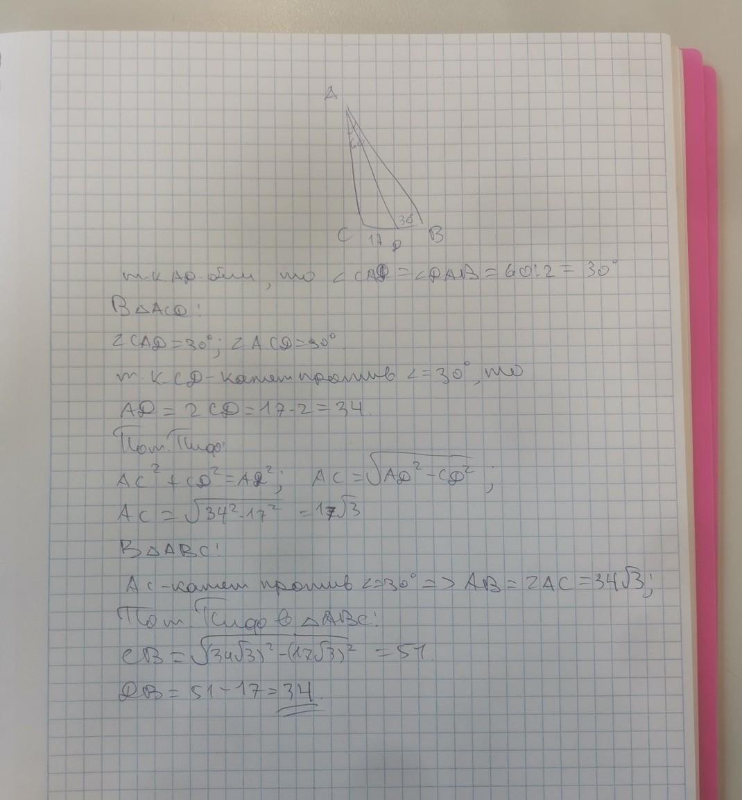 60°, проведена биссектриса AD. CD=17см. Найдите длину DB.