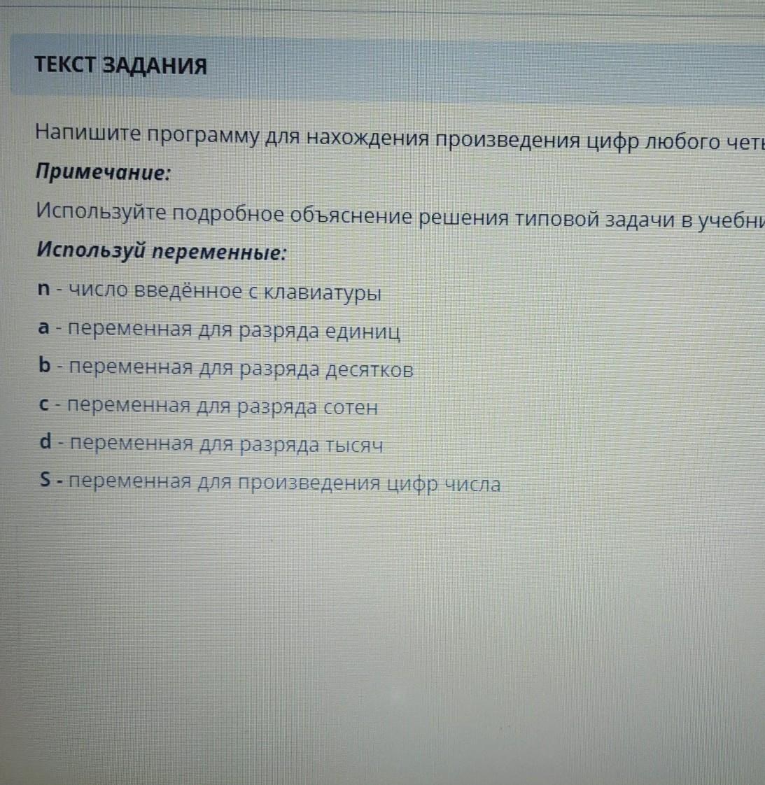 Напишите программу для нахождения произведения цифр любого четырёхзначного числа.