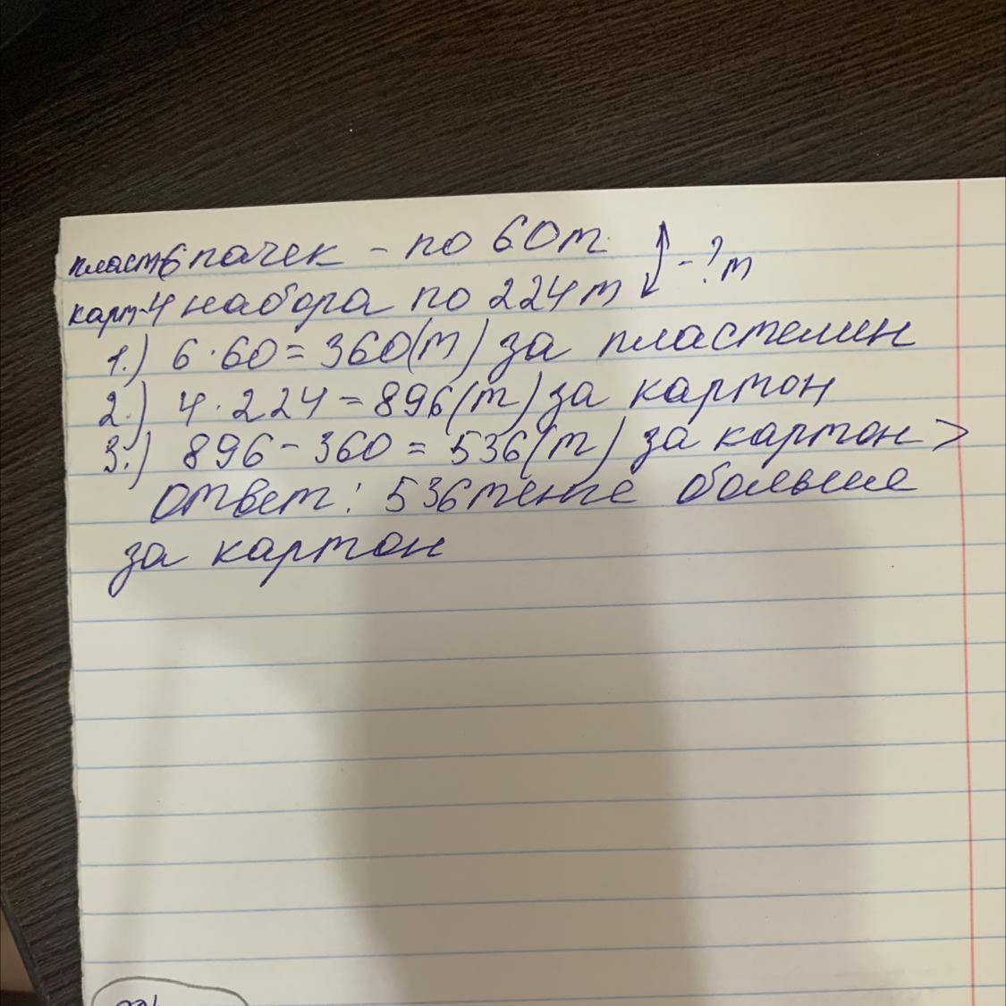 Помогите решить задачу пж пж!!Для урока труда купили 6 пачек пластилина по 60 тенге и 4 набора цветного картона по 224 тенге.На сколько больше денег заплатили за картон,чем за пластилин?(Даю 50 баллов)