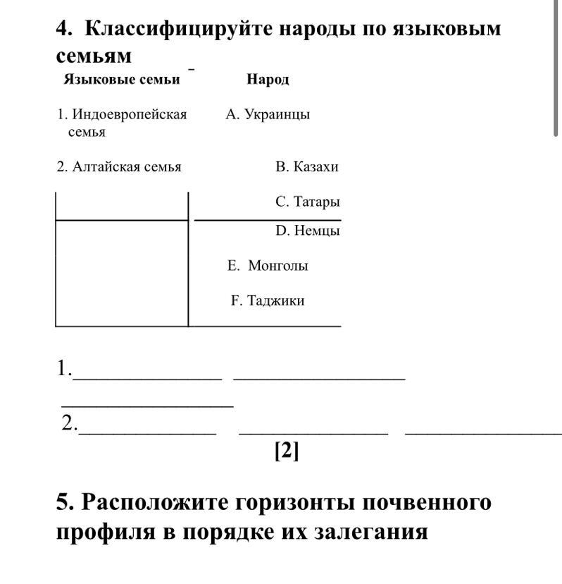 4. 1. Индоевропейская семья: A. Украинцы, D. Немцы, F. Таджики.
