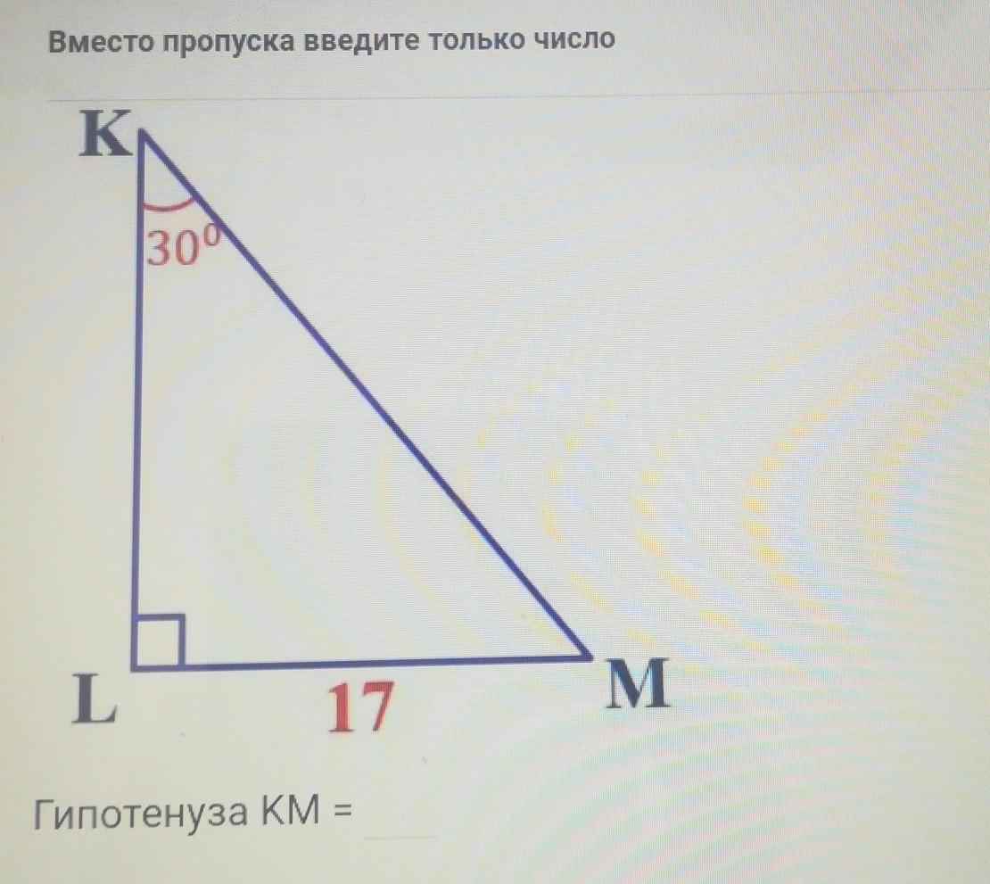 Угол 30 градусов равен половине гипотенузы. Тогдо гипотенуза 17+17=34
