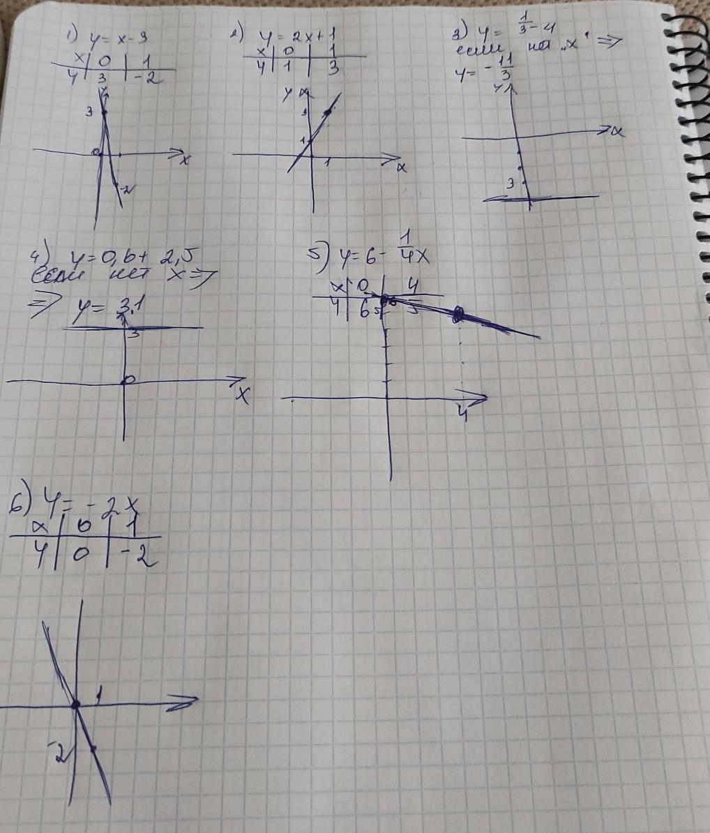 побудуйте графік лінійної функції і табличку: 1)y=x-3; 2)y=2x+1;3) y=1/3-4;4) y=0,6+2;5) y=6-1/4x; 6) y=-2х