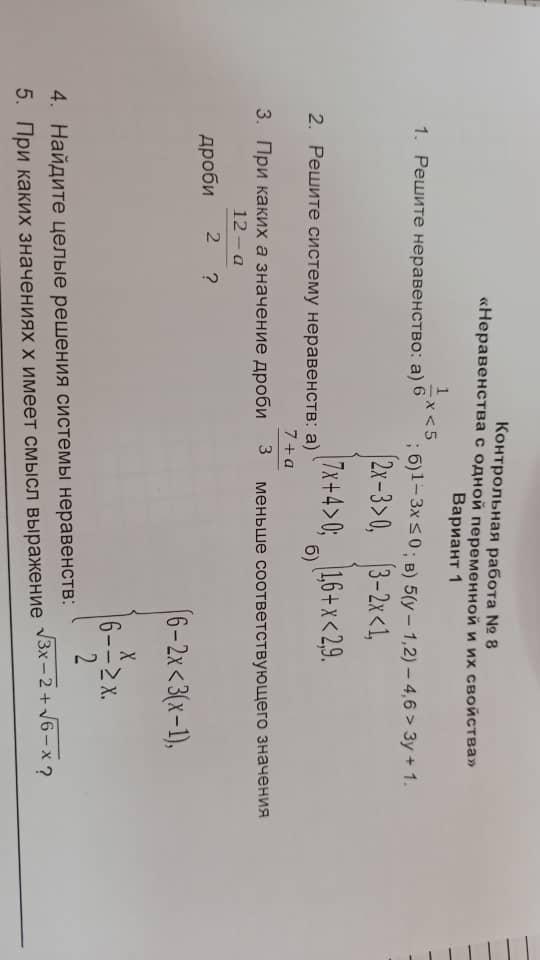 1. a) x/6<5 б) 1-3x<=0 в) 5(y-1,2)-4,6>3y+1