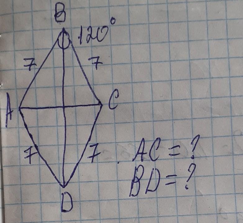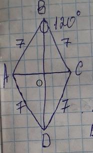 ∠ABO=∠CBO=120/2=60°(Диагонали ромба делят его углы пополам)