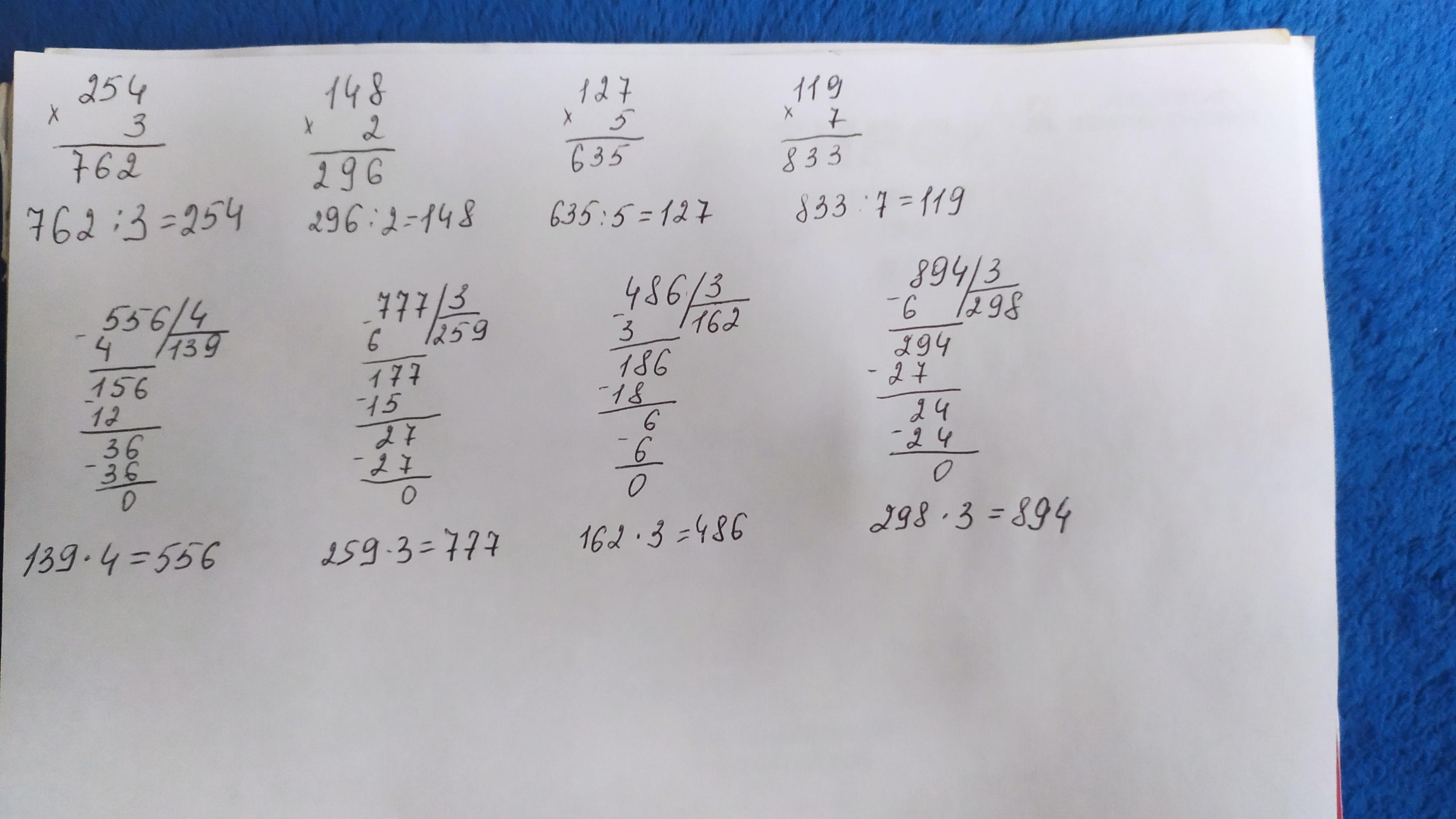 Вычисли, записывая выражения столбиком. Выполни проверку. а) 254 * 3 148*2 127*5 119*7 556/4 777/3 486/3 894/3