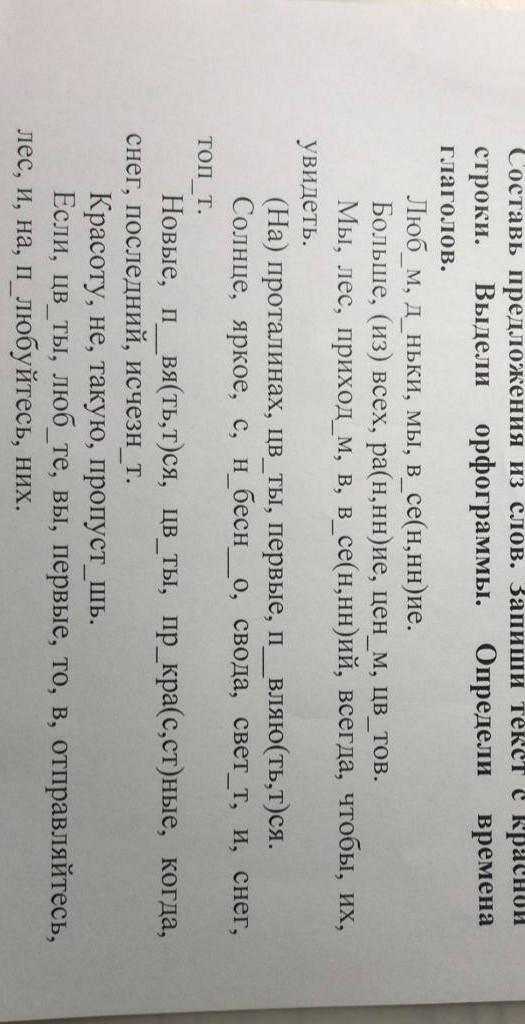 Мы любим(наст. вр.) весенние деньки. Больше всех цветов ценим(наст. вр.) ранние. Мы всегда приходим(наст. вр.) в весенний лес чтобы их увидеть(неопр. ф.). На проталинах появляются(наст. вр.) первые цветы. С небесного свода светит(наст. вр.) яркое солнце и топит(наст. вр.) снег. Когда последний снег исчезнет(буд. вр.), появятся(буд. вр.) новые прекрасные цветы. Такую красоту не пропустишь(буд. вр.). Если вы любите первые цветы, то отправляйтесь(буд. вр.)в лес и полюбуйтесь(буд. вр.) на них.