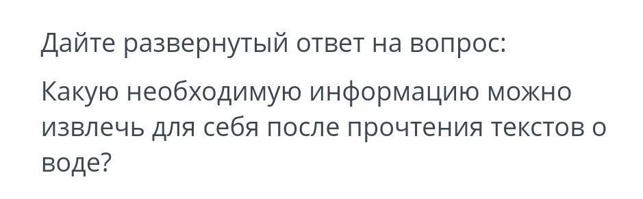 смотря какой текст. Если текст познавательный то можно понять что вода главная часть для происхождения жизни на нашей планете, без воды не смог бы выжить не один живой организм. Вода так же повлияла на нашу атмосферу. Без таких больших запасов воды в океанах наша планета была бы в разы горячее.