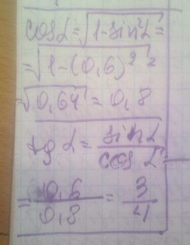 Найти tg альфа, cos альфа если sin альфа = 0.6