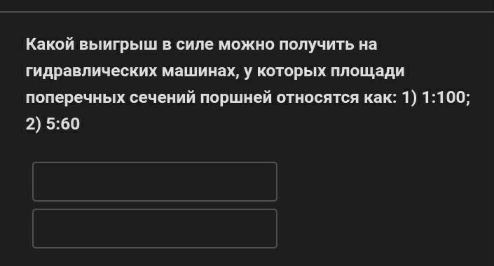 Какой выигрыш в силе можно получить на гидравлических машинах,у которых площади поперечных сечений поршней относятся как: 1)1:100;2)5:60й