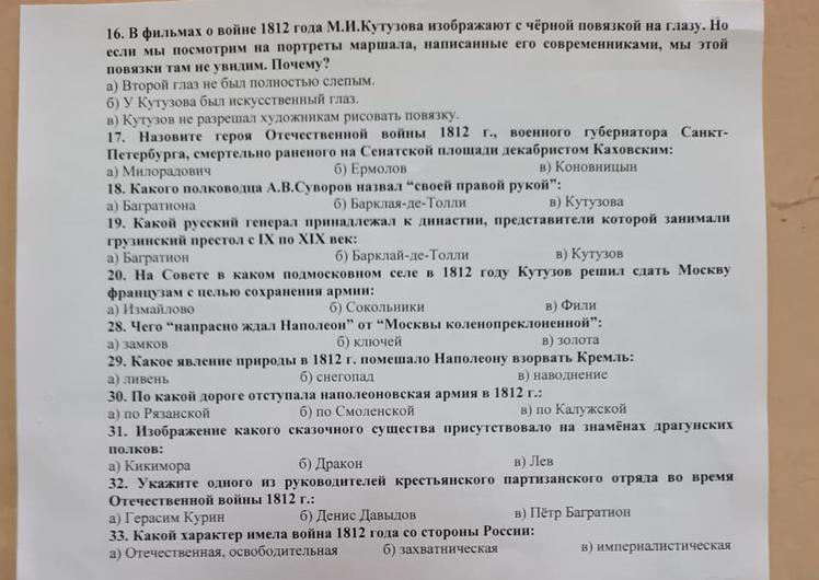 16. Вопреки существующему мнению, подтверждения факта, что полководец был слеп на правый глаз, нет. Так же как нет ни одного письменного упоминания современников о повязке. На всех прижизненных портретах фельдмаршал изображен без нее. Впервые пресловутая повязка, словно у пирата, появилась у Кутузова в 1943 году в одноименном фильме. Шла Вторая мировая война, и зрителю нужно было показать, что даже после тяжелого ранения можно продолжать сражаться.