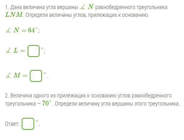 1. ∠L = ∠M = (180° - 64°)/2 = 116°/2 = 58°