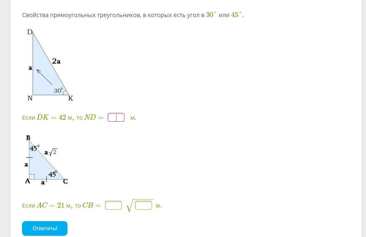 короче когда 30° то катет равен половине гипотенузе а ,если в прямоугольном треугольнике острый угол равен 45° , то этот треугольник является равнобедренным
