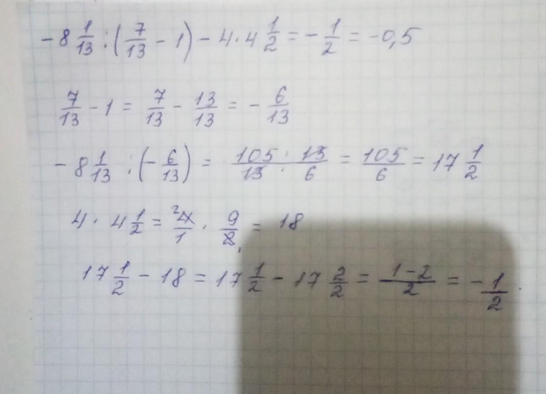 вычисли 8 1/13:(7/13-1)-4*4 1/2 первое действие (знак минус запиши в числитель)