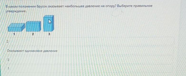 Правильный ответ под номером 3, так как площадь опоры минимальна, а значит давление, которое создаёт брусок, выше.