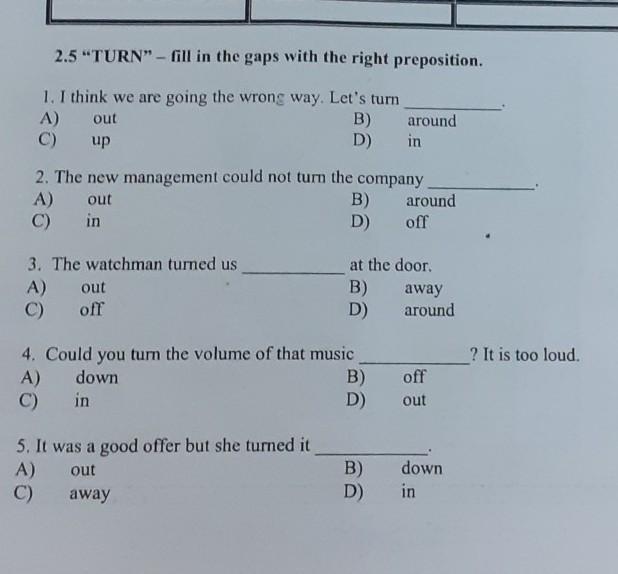 2.5 -TURN" - fill in the gaps with the right preposition.