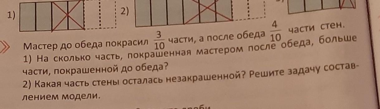 1) 4/10-3/10 = 1/10 - на 1/10 больше, чем до обеда;