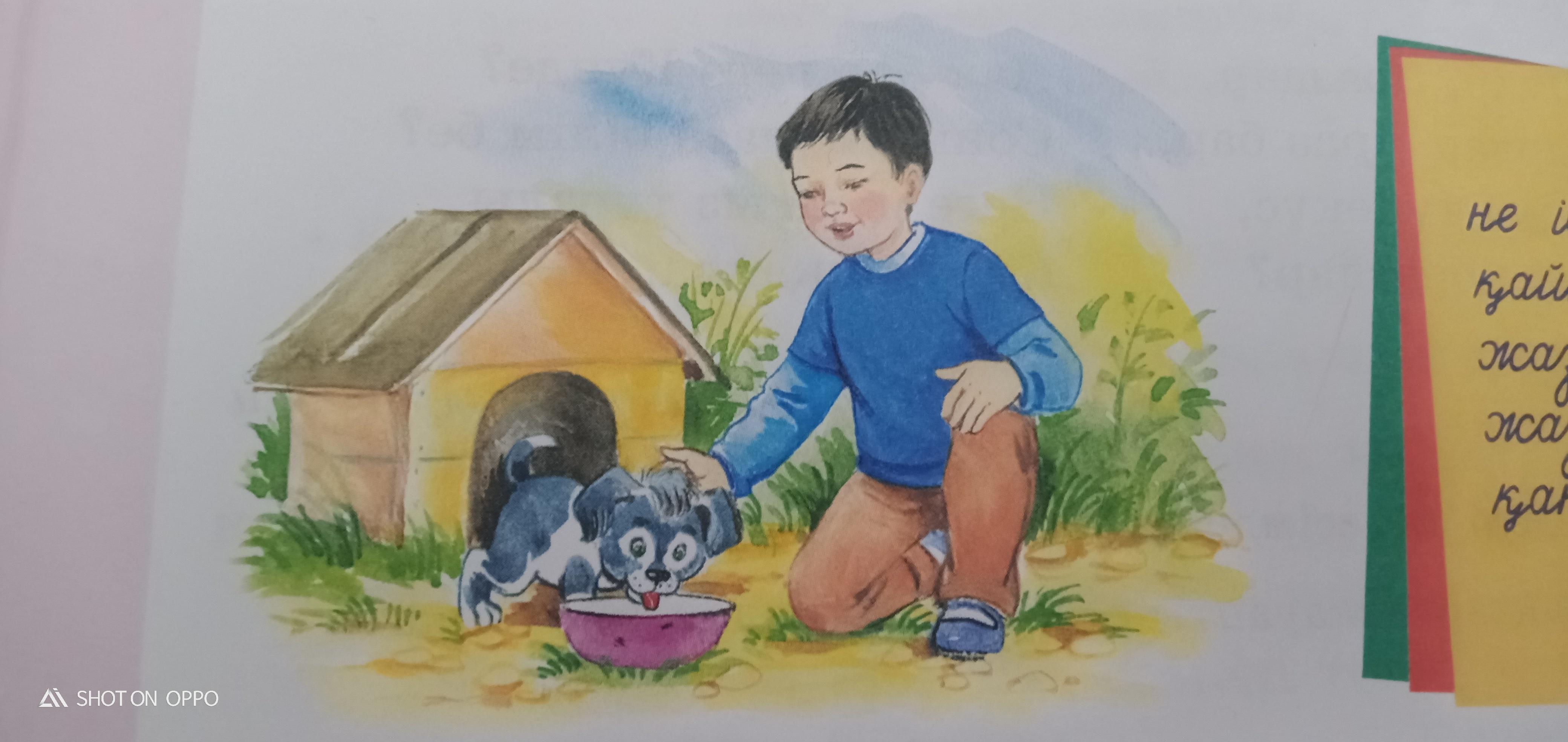 Күшікке аяушылық білдіріп, сүт береді. Күшіктің тамақтанғанын көріп балалар қуанады.