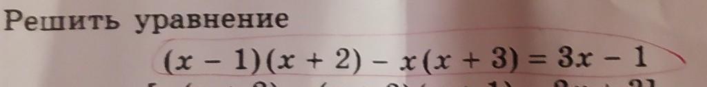 (x - 1)(x + 2) - x(x + 3) = 3x - 1 \\   {x}^{2}   + 2x - x - 2 -  {x}^{2}  - 3x = 3x - 1 \\  - 2x - 2 = 3x - 1 \\  - 2x - 3x =  - 1 + 2 \\  - 5x = 1 \\ x =  - 0.2