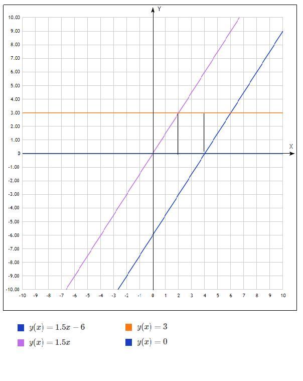 s=∫1.5x*dx+∫3dx+∫(3-(1.5x-6))dx=+3x+9x-1.5x^2/2=3+6+3=12