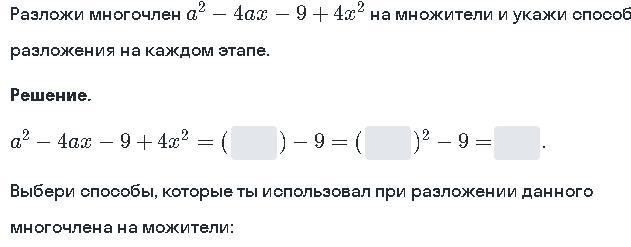 (Выбрать правильный ответ в 1. способ группировки или Вынесение общего множителя за скобки и т.д)