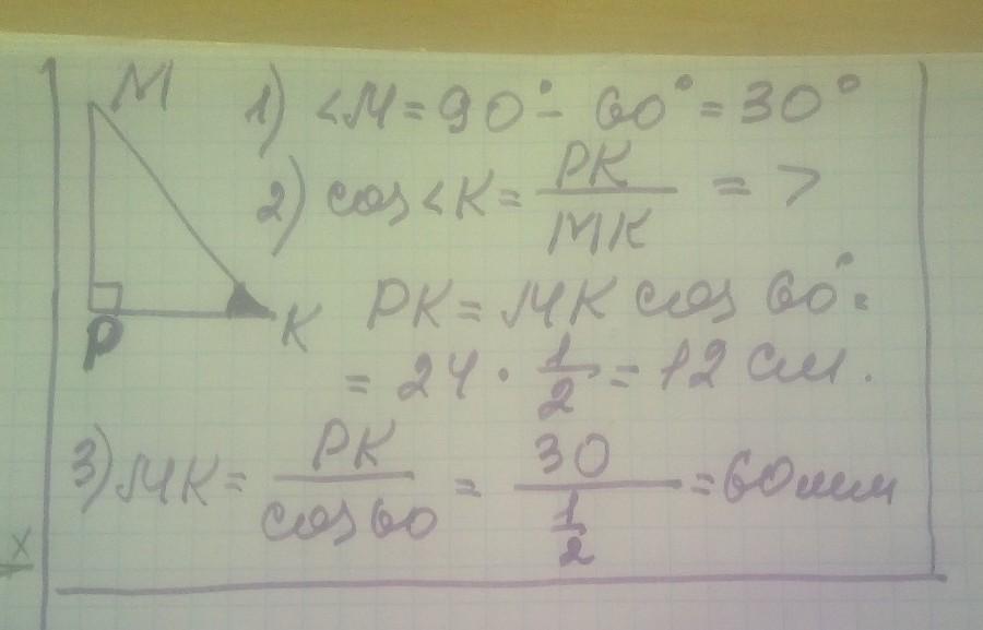 2) РК - катет, лежащий напротив угла в 30°, тогда по теореме он равен половине гипотенузы МК, получим